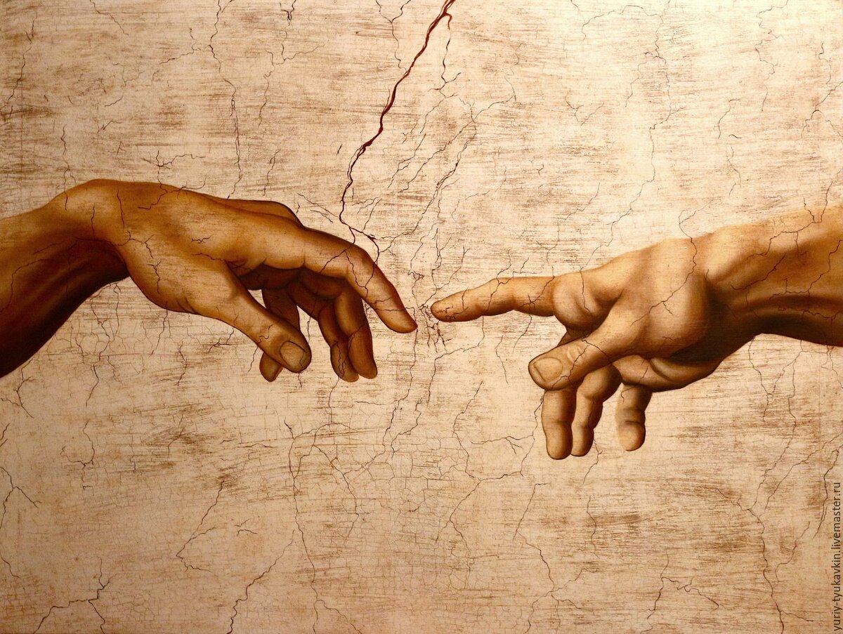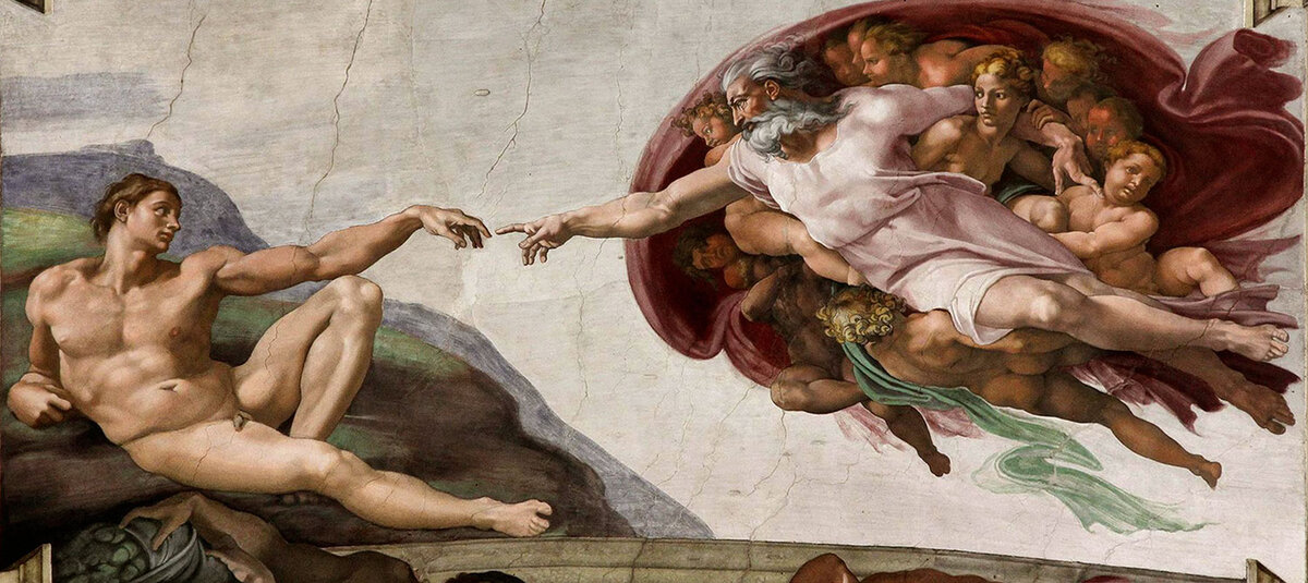 Бог приближается к созданному им Адаму, чтобы дать ему искру жизни, прикоснувшись. Есть мнения, что присмотревшись, можно увидеть энергию жизни между вытянутыми пальцами Создателя и его Создания.