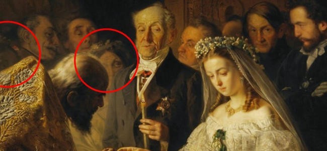 Печальная невеста и обеспеченный жених. На первом плане изображена милая и печальная невеста. Девушка обречённо протягивает пальчик в сторону священника, который вот-вот должен провести обряд обручения. И душой угадывается как дороги невесте эти последние секунды свободы. Её ещё детское лицо, белоснежное платье говорят о невинности чувств и мыслей и словно окружают невесту особым светом. Но в церкви присутствует и тот, для которого данное таинство схоже с истинным наслаждением. Это обеспеченный жених, преклонного возраста, который вот-вот поймает голубку в свои сети. Он с нетерпением взирает на девушку, осознавая свою власть.